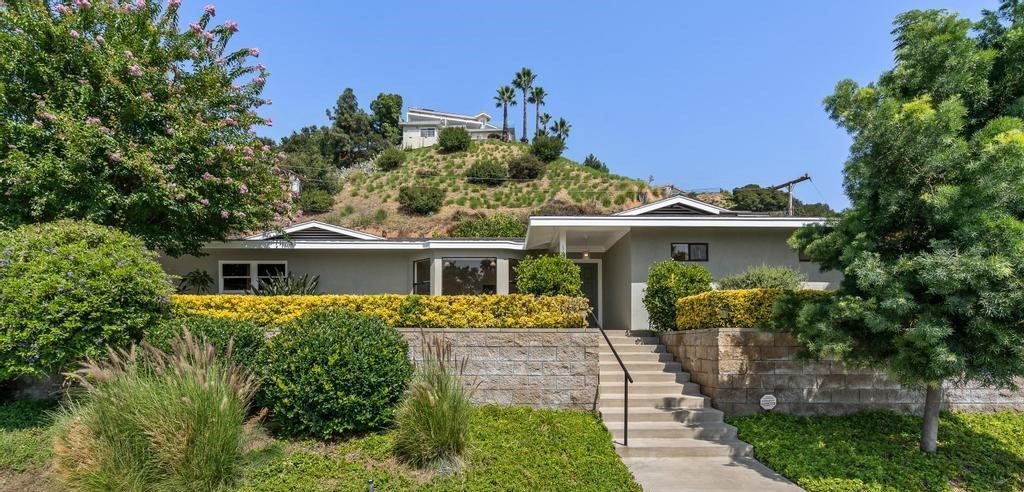 Impeccable east Altadena contemporary ranch, nestled on an elevated knoll with wonderful valley views. Private corner home with a double attached direct access garage. Shaded by a colorful Crepe Myrtle & dotted with scented gardenias the front pathway opens to a cozy tiled entry. A sunny bay window lights the spacious living room while providing serene day or evening vistas. Sharply remodeled kitchen with warm oak cabinetry, granite counters, subway backsplash, stainless appliances, a farmhouse sink, roomy kitchen island, recessed lighting & mottled tiled floors. Perfect the adjacent dining area opens to a cozy family room with a custom mantled electric fireplace and sylvan views to the rear yard. Ideal, all bedrooms are located on the east side. The generous master suite is bright with double closets, a large skylight to take in those starry nights, along a pleasantly remodeled bath with a walk-in shower, soaking tub, skylight, subway tiles, and marble flooring. Two additional bedrooms wrap to the rear & share an updated full bath with new vinyl flooring & hardwood vanity. Numerous amenities include freshly painted interior & exterior, new plush Frieze carpeting, new lighting fixtures, recessed lighting, ceiling fans, copper plumbing including the water main, updated electrical panel. automatic garage door opener and automated sprinkler system. Relax & enjoy the delightful rear yard dappled with Plumeria, Grevillea, and various Cacti, and over the patio, the leafy bough of a Fruitless Mulberry Tree. Enclosed with a tall masonry wall, dual gates, and fencing, the backyard becomes one’s own private oasis.