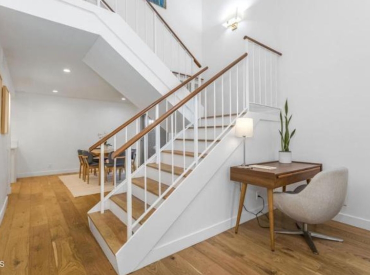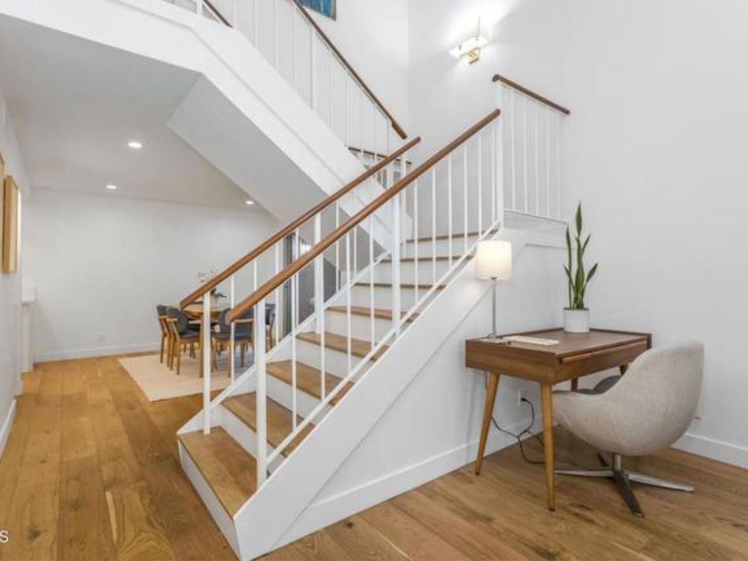 Recent upgrades include European white oak flooring, recessed lighting, custom shaker doors, dual pane windows with custom blinds, a Nest thermostat, new central heating and air conditioning, and remodeled bathrooms with glass enclosures. The primary suite is a standout, offering a private balcony and a custom closet system.