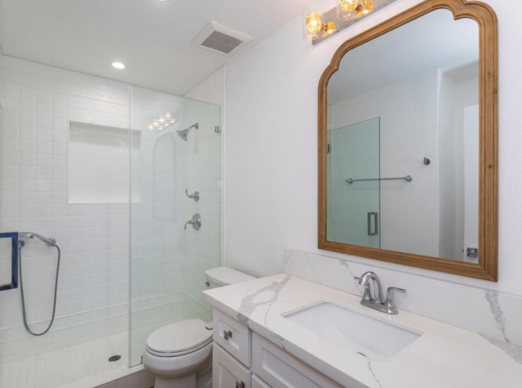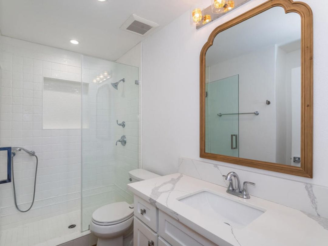 The updated kitchen features custom cabinetry, Calacatta quartz countertops with a waterfall edge, and Whirlpool stainless steel appliances. It opens to the dining area and a private patio, creating an easy indoor outdoor flow for everyday living and entertaining.