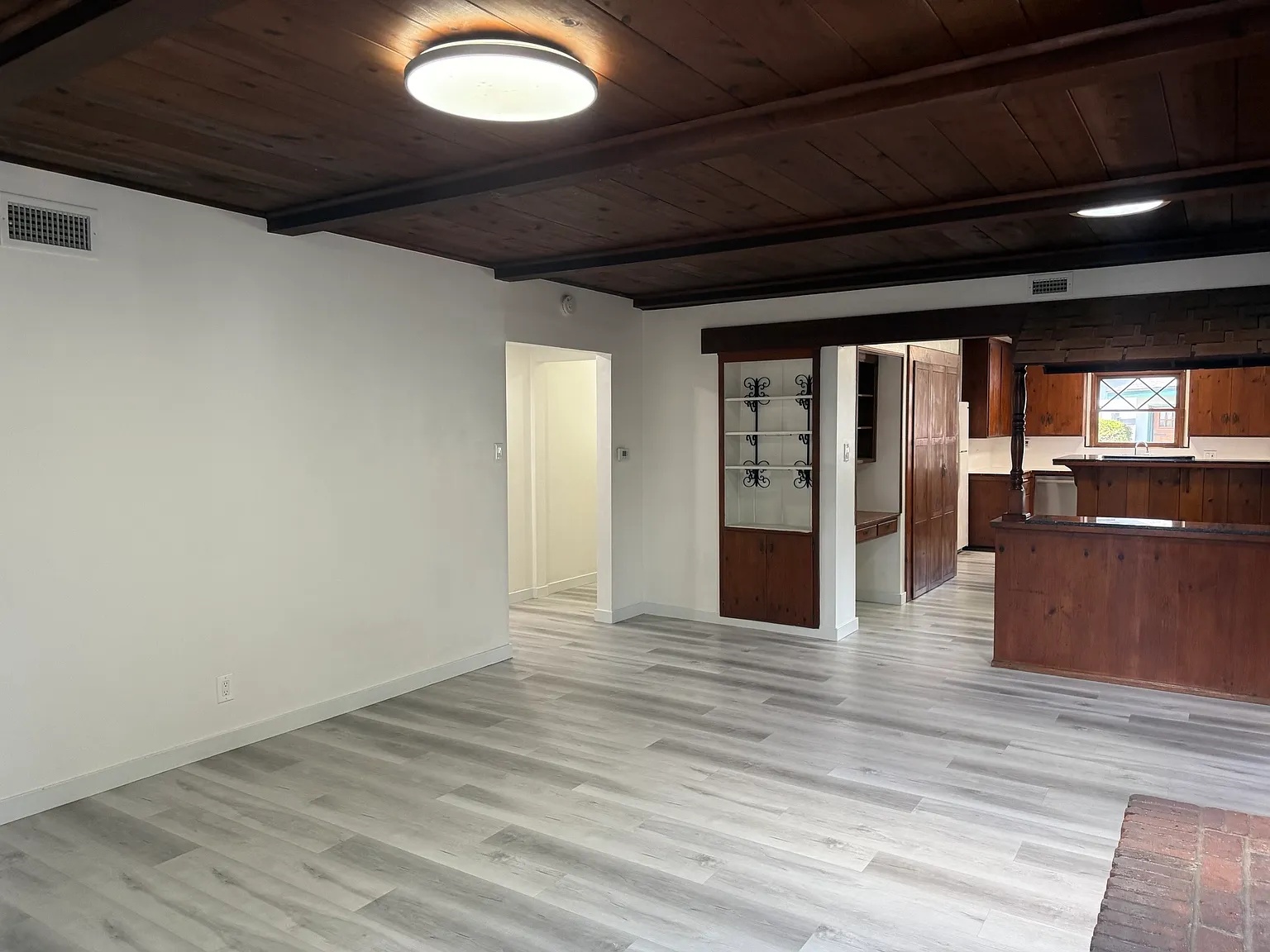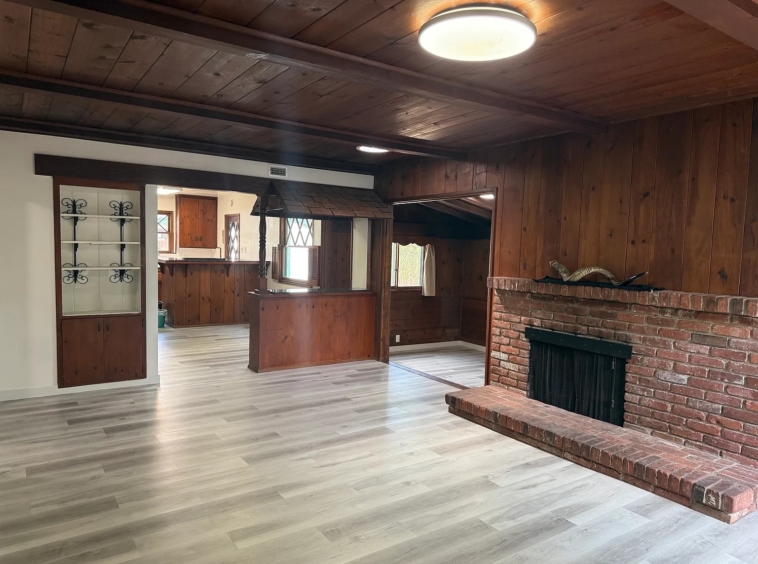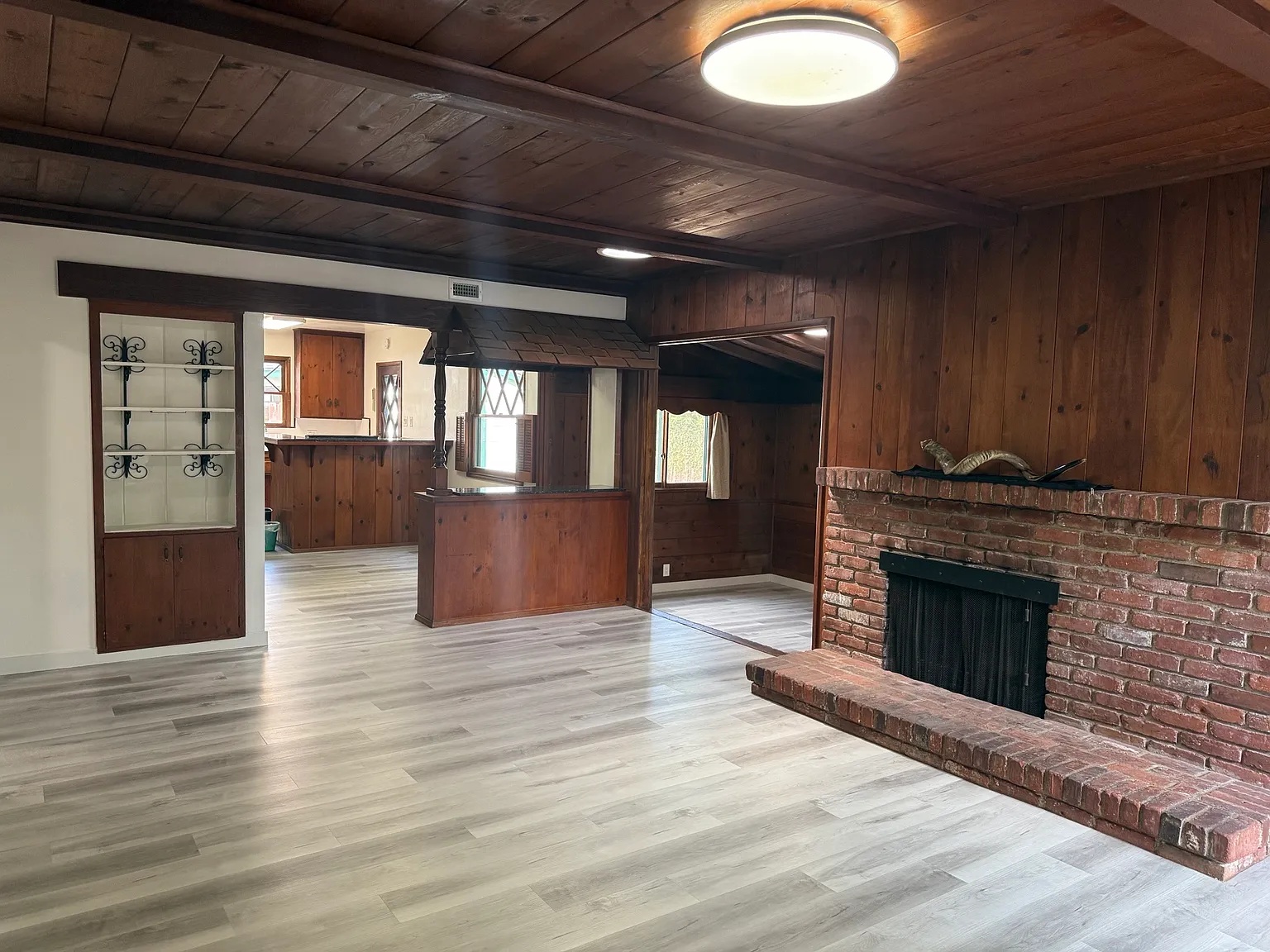 Recently refreshed with brand new luxury vinyl plank flooring and fresh interior paint, the home features a spacious flowing floor plan ideal for everyday living and entertaining. The large living room showcases beamed ceilings and a cozy brick fireplace, opening seamlessly to the dining area and kitchen for an inviting central gathering space.