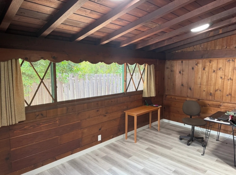 A separate den adds valuable flexibility and can function as a home office, playroom, or potential fourth bedroom. Decorative windows and solid redwood paneled walls give this space warmth and character.